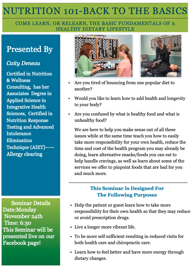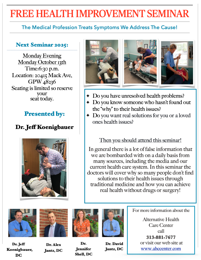 The Health Improvement Seminar is done monthly which discusses a variety of topics that contribute to one’s overall health. In general there is a lot of false information that we are bombarded with on a daily basis from many sources, including the media and our current health care system. In this seminar we will cover why so many people don’t find solutions to their health issues through traditional medicine and how you can achieve real health without drugs or surgery!