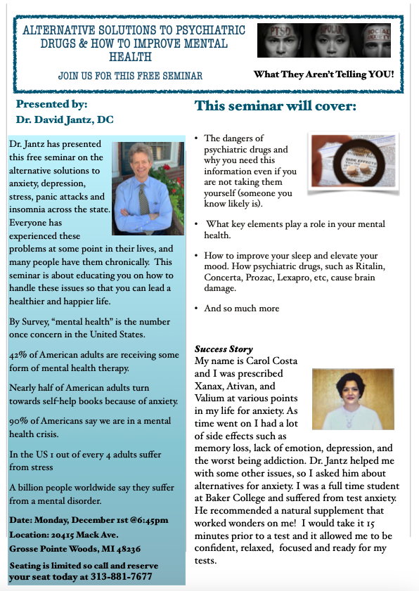 Dr. Jantz has been delivering this vital seminar to schools, other healthcare practitioners and our patients here. The message is more important than ever. Every one of us has been impacted by the dangerous and false solutions being given to our friends and family who experienced mental health issues. Here are some statistics to show you how widespread this problem is: